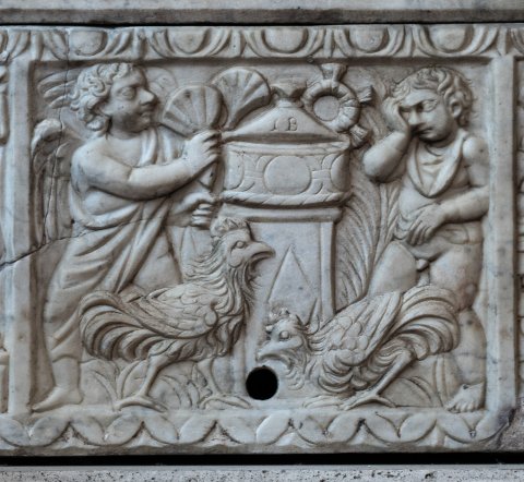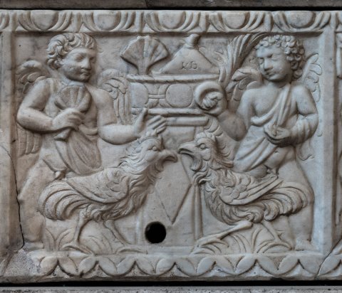 Auf der Kastenvorderseite drei Bildfelder. In der Mitte schmales Feld mit stehendem Knaben in Toga, in der Linken volumen, im Hintergrund Vorhang. Seitlich je ein Feld mit zwei Eroten und kämpfenden Hähnen. An den Ecken Schuppenpilaster, auf den Schmalseiten Quaderimitation.