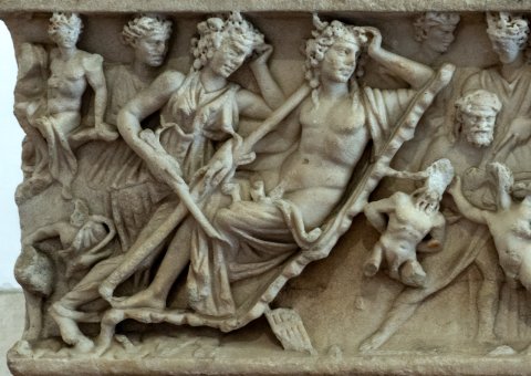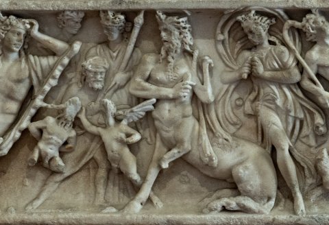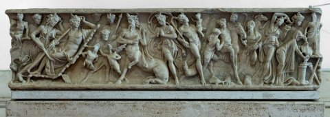Mythische Figuren. Links gelagert Dionysos und Ariadne, bekränzt, er mit Thyrsosstab, sie mit Fackel; oben links kleinerformatiger sitzender Jüngling, unten Knabe mit Panther. Weiter rechts Zweikampf zwischen Pan und Amor, dahinter Kampfrichter und Frau mit Thyrsosstab. Anschließend auf den Hinterbeinen sitzender Kentaur mit Lyra und tanzende Mänade, Satyr mit kleinem Knaben auf dem Arm, Mänade und auf Maultier sitzender Silen, Pan mit Pedum, tanzende Mänade; ganz rechts Gruppe von zwei Frauen beim Opfern eines Hahns und darüber stehender Silvanus (?) .