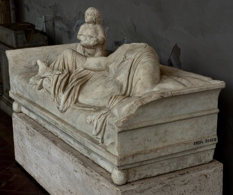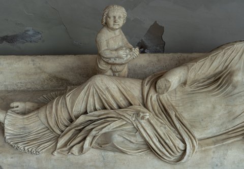 - Auf eine Kline gelagerte Frau, linker Arm auf Kissen mit Fransensaum gestützt; hinter dem rechten Bein stehendes Kleinkind (Knabe), das in der hochgeschürzten Tunica Früchte hält.