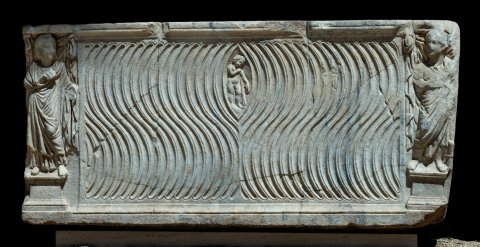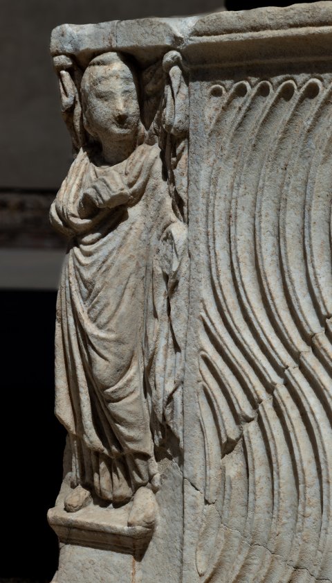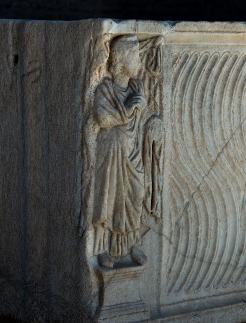 Riefelsarkophag, an den Ecken der Vorderseite auf Podesten stehendes Ehepaar: links Frau in Tunica und Mantel, mit Scheitelzopffrisur, rechts bärtiger Mann in Toga, neben dem linken Fuß Rollenbündel; hinter beiden Figuren aufgehängte Draperie.