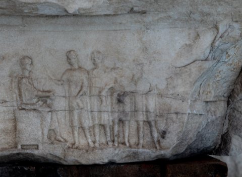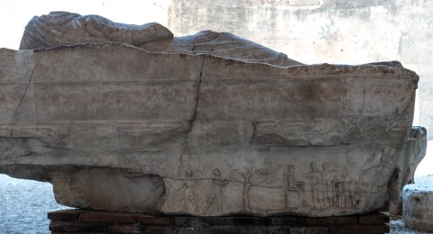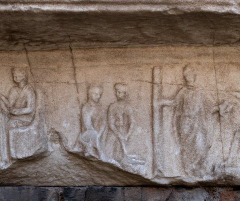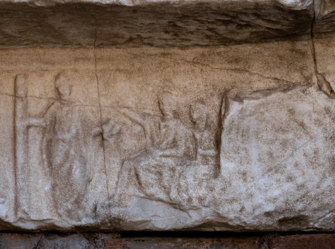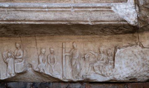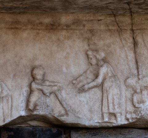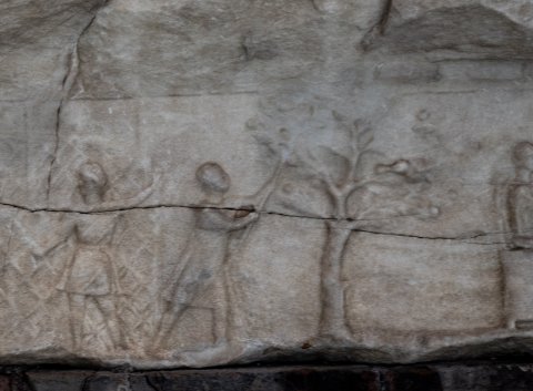 - unten u. rechts abgebr., Köpfe verloren, Oberfläche verrieben, tlw. abgeschlagen