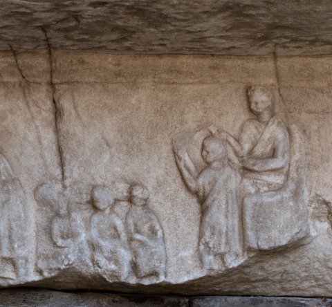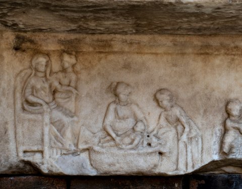 Der Unterteil der Kline zeigt auf der Vorderseite Reliefszenen aus Kindheit und Erwachsenenleben des Verstorbenen (Bad des Neugeborenen, Rollerfahrt des Kleinkindes, Schulunterricht, Wettlauf, Auftritt des jungen Mannes vor zwei Zuhörern). Auf der rechten Nebenseite nur ein Kopf erhalten.