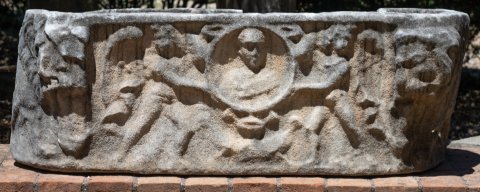 - Ovaler Sarkophagkasten mit Löwen an den Schmalseiten. Vorn von Eroten getragenes Medaillon mit Büste in Toga contabulata; unten Füllhörner.