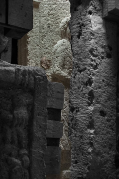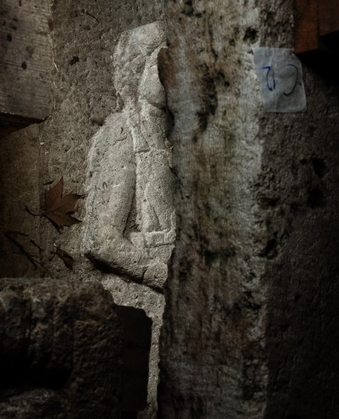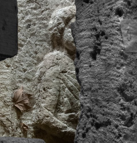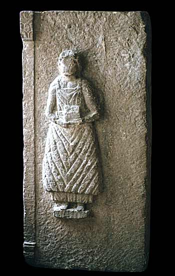 - Linke Seitenwange. Auf der Außenseite zwischen Pilastern Attis, auf Hirtenstab (Pedum) gestützt. Auf der Innenseite Dienerin in Ober- und Untergewand, Gürtel, Fibeln, in den Händen Kästchen. Füße auf schmalem Podest.