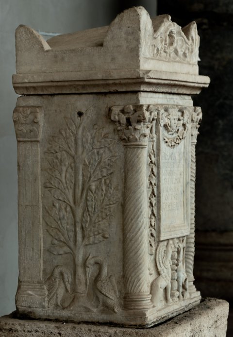 Auf den Nebenseiten Baum zwischen Wasservögeln, an den hinteren Ecken glatte Pilaster. - Inschrift