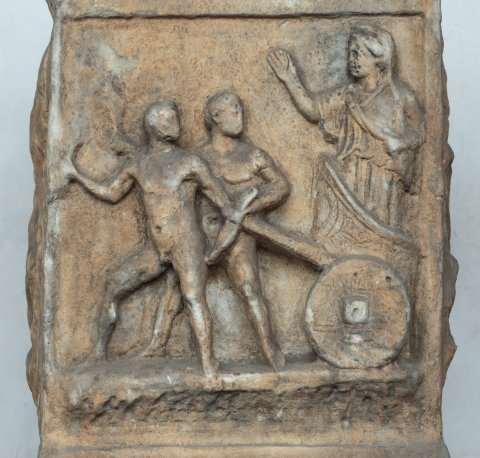 Mythos: auf der Vorderseite Kleobis und Bithon mit Fackeln in der Rechten, die den Wagen mit ihrer darauf stehenden Mutter ziehen.