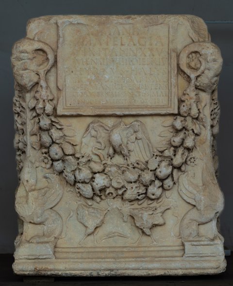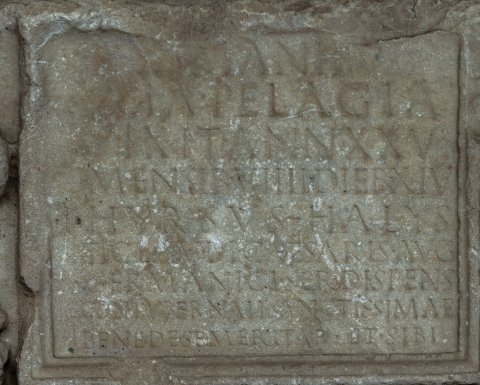 - [Dis] Manibus / [Ac]cia Pelagia / vixit ann(is) XXV / mensib(us) VIIII dieb(us) XIV / Thyrsus Halys / Ti(beri) Claudi Caesaris Aug(usti) / Germanici ser(vus) dispens(ator) / contubernali sanctissimae / bene de se meritae et sibi