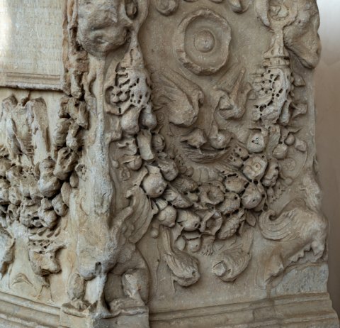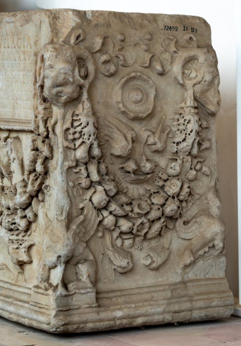 - Auf der Vorderseite gerahmtes Schriftfeld, an allen vier Ecken Widderköpfe, an denen auf Vorder- und beiden Nebenseiten Fruchtgirlanden hängen. Auf der Vorderseite im Girlandenbogen Adler, auf den Nebenseiten Gefäße und Vögel. Unten an den Ecken hockende Sphingen, unterhalb der Girlanden vorn zwei Hähne, links Vogel und Eidechse, rechts zwei Vögel.