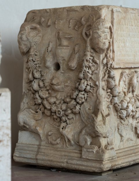 - Deckelfehlt, oben Aushöhlung für die Aschenurne, Inschrift und Relief bestoßen u. verrieben