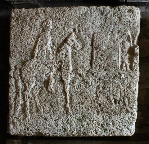 - Wagenszene: vierrädriger Planwagen mit Fahrgast, Kutscher und Zweigespann, dahinter Reiter in kurzer Tunica und Sagum.