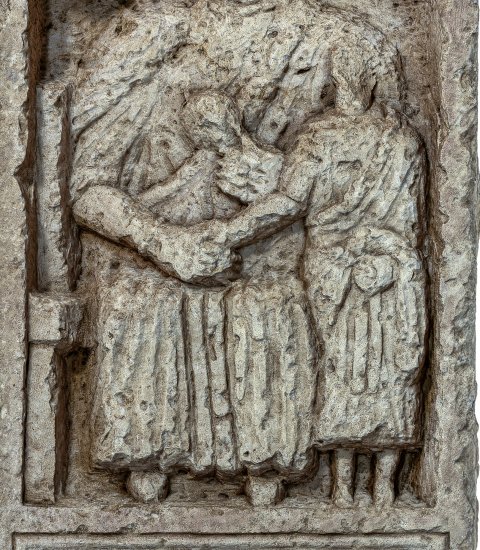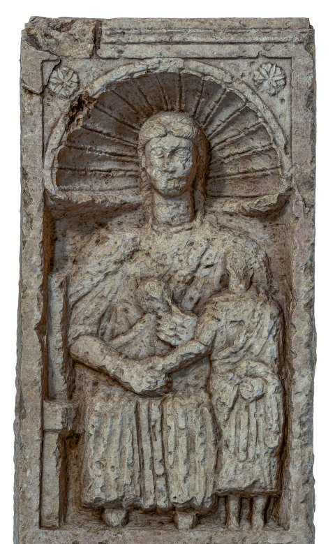 - Stele mit gerahmtem Schriftfeld, darüber Nische mit Muschelbaldachin, darin zwei Ganzfiguren: sitzende Frau in Tunica und Mantel, die die Hand des zu ihrer Linken stehenden Kindes (Mädchen) hält.