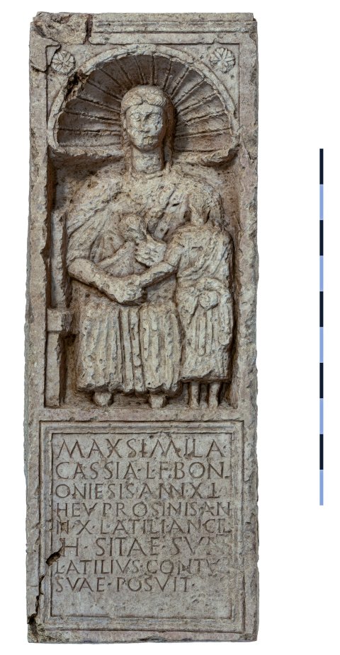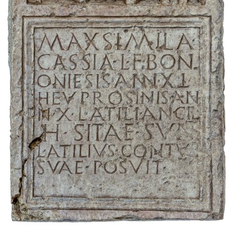 - Maxsimil(l)a(!) / Cassia L(uci) f(ilia) Bon/onie(n)sis ann(orum) XL / Heuprosinis an/n(orum) X L(uci) Atili ancil(la) / h(ic) sitae sunt / L(ucius) Atilius contub(ernali) suae posuit