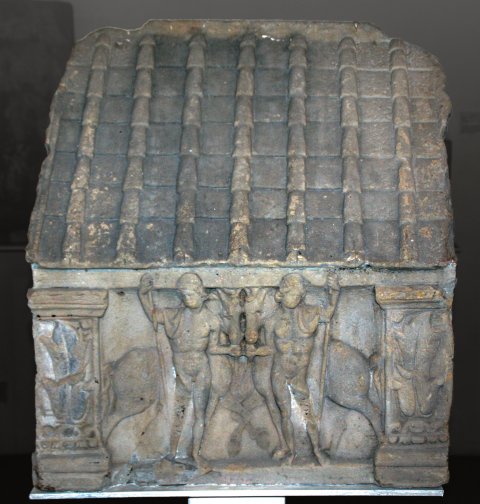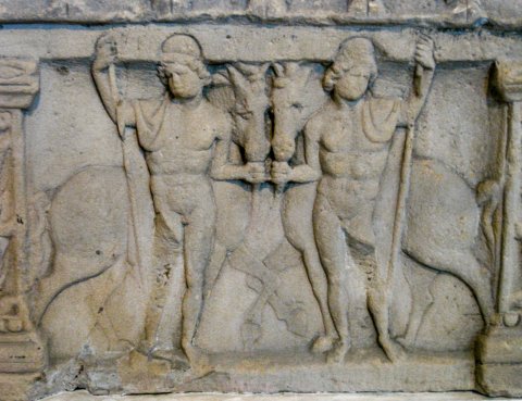 Auf der linken Langseite Dioskuren, vor ihren Pferden stehend.