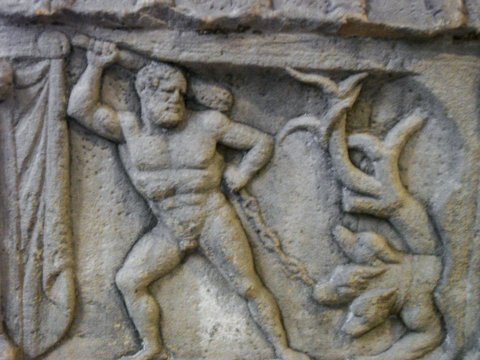 Auf der rechten Langseite Mythos: Hercules führt den Zerberus (Kerberos) an einer Kette aus der Unterwelt, hinter dem Tier Baum, links Vorhang.