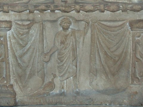 Auf der Rückseite im Giebelfeld Blattdekor, zwischen den Pilastern rechts und links Vohänge, in der Mitte stehende Juno mit Schlae und Szepter, neben dem rechten Fuß Pfau.