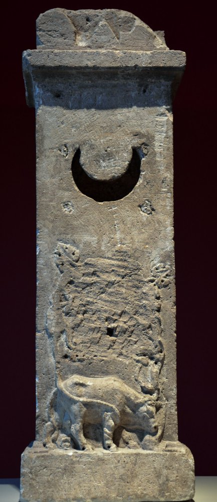 - Altar ausgehöhlt, auf der Vorderseite Mondsichel ausgeschnitten, darunter abgemeißeltes Relief (Reste von Weinranken), unten auf dem Sockelvorsprung Stier nach rechts gehend.