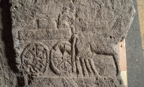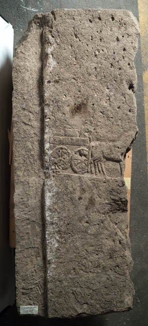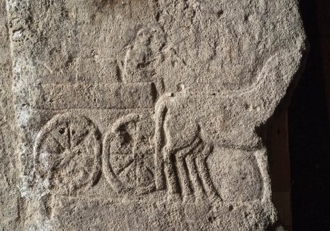 - Wagenszene: Ritzzeichnung: vierrädriger offener Wagen mit Kutscher und Zweigespann.