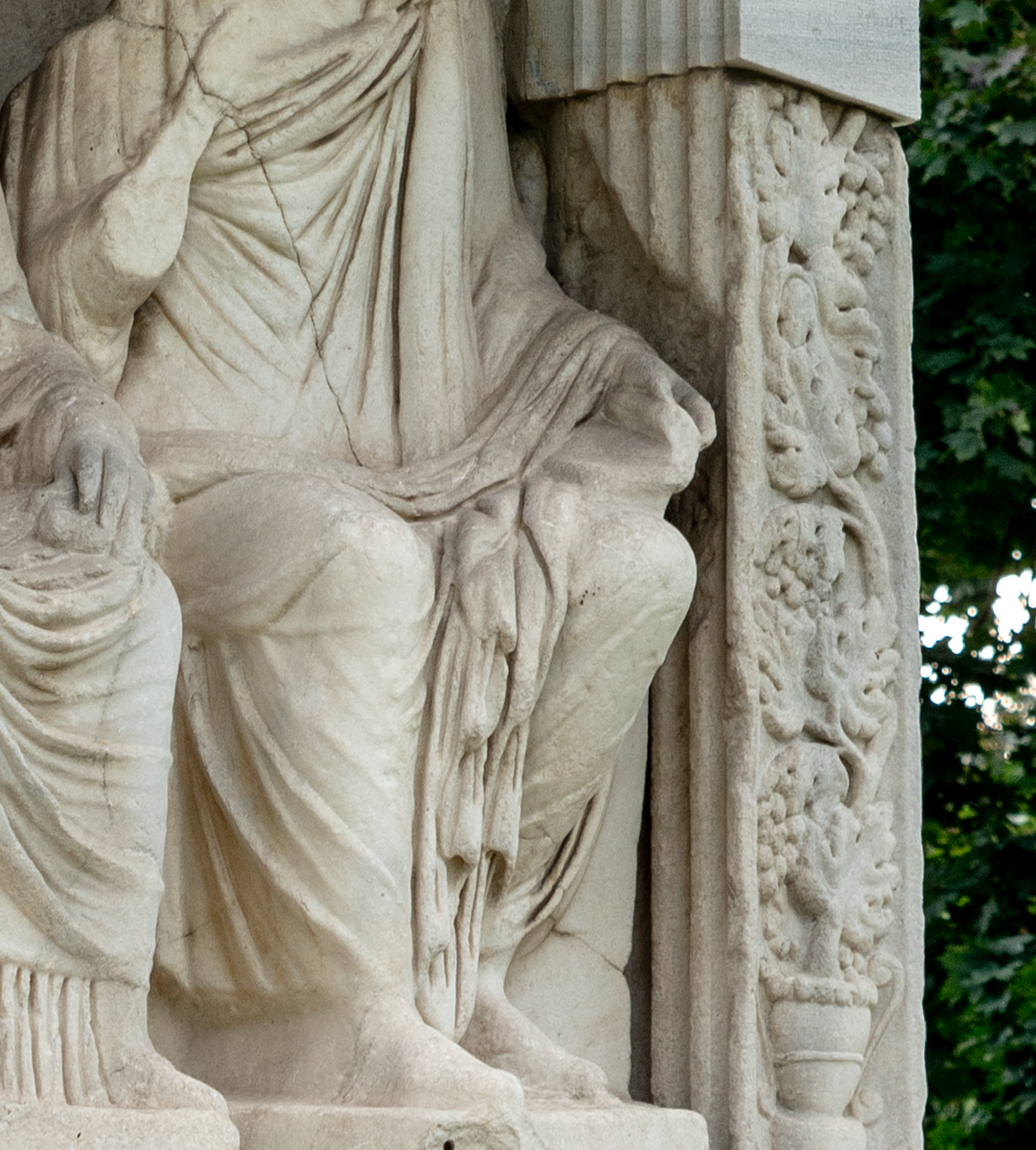 Die bei der Rekonstruktion verwendete Seitenwand (Nr. 4+43) stammt von einer kleineren Ädikula und ist um 20 cm kürzer als der original erhaltene Wandsockel. Das heißt, dass die Originalädikula um 20 cm tiefer war als die vor 1972 errichtete Rekonstruktion. Daher befindet sich der Frontpilaster der rekonstruierten Ädikula (Nr. 4) zu weit hinten und gerät mit dem Unterarm der rechten Sitzstatue in Konflikt. Um die Statue trotzdem unterbringen zu können, wurde der Frontpilaster auf eine Art ausgemeißelt, die für die Antike ungewöhnlich ist.