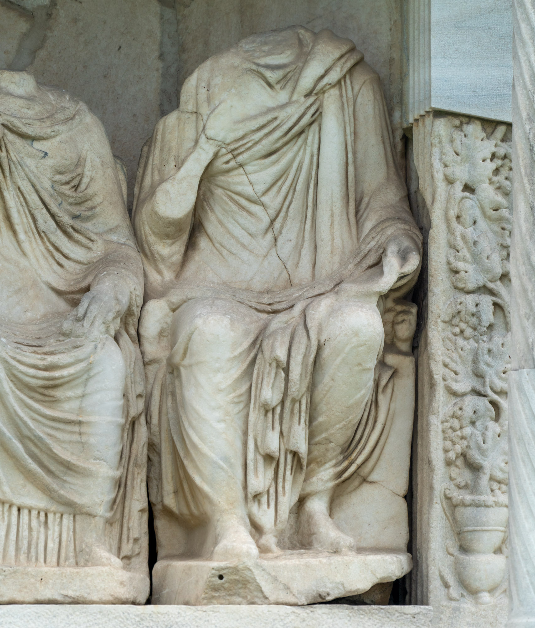 Die bei der Rekonstruktion verwendete Seitenwand (Nr. 4+43) stammt von einer kleineren Ädikula und ist um 20 cm kürzer als der original erhaltene Wandsockel. Das heißt, dass die Originalädikula um 20 cm tiefer war als die vor 1972 errichtete Rekonstruktion. Daher befindet sich der Frontpilaster der rekonstruierten Ädikula (Nr. 4) zu weit hinten und gerät mit dem Unterarm der rechten Sitzstatue in Konflikt. Um die Statue trotzdem unterbringen zu können, wurde der Frontpilaster auf eine Art ausgemeißelt, die für die Antike ungewöhnlich ist.