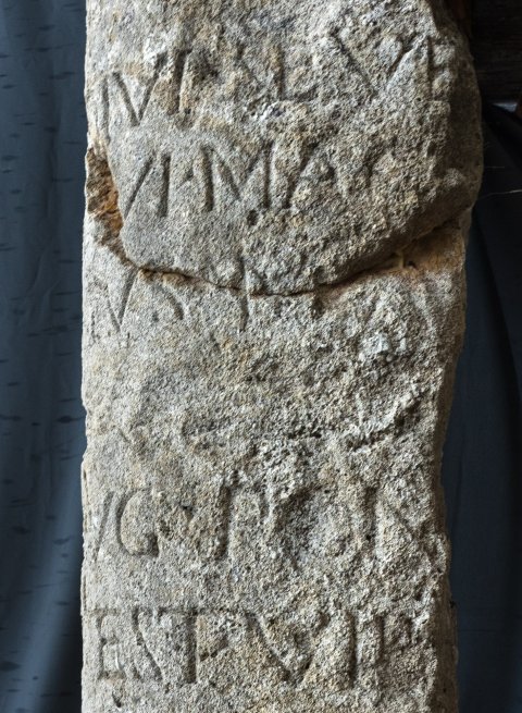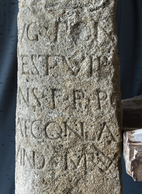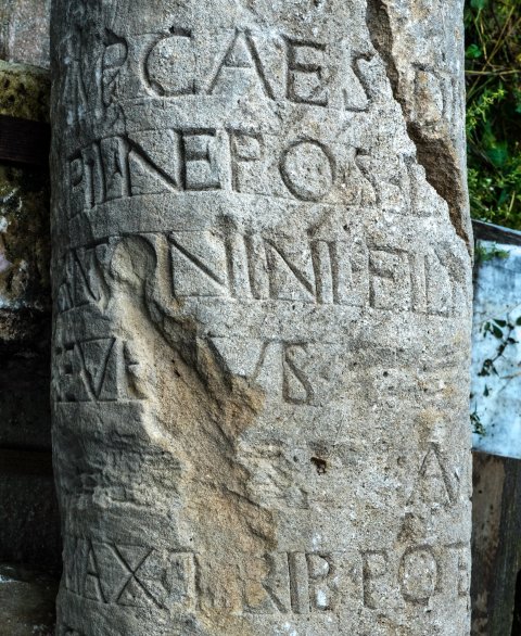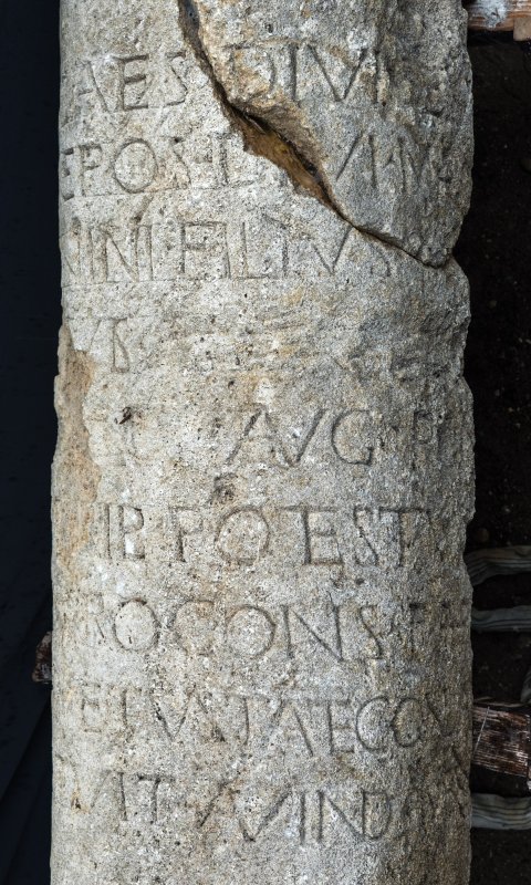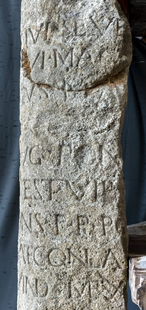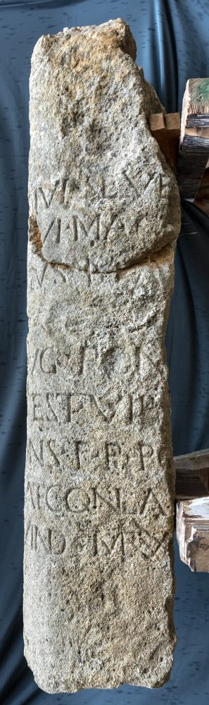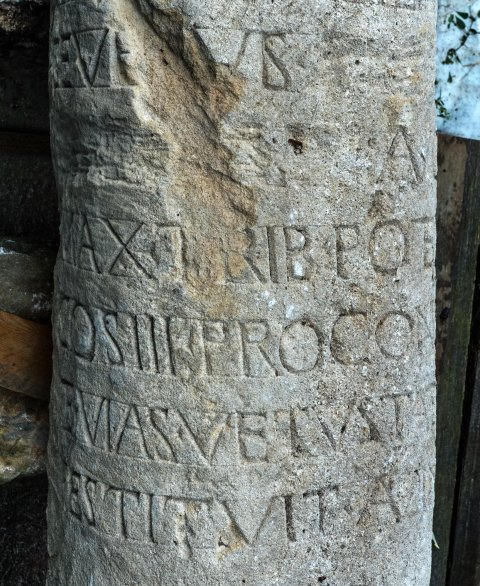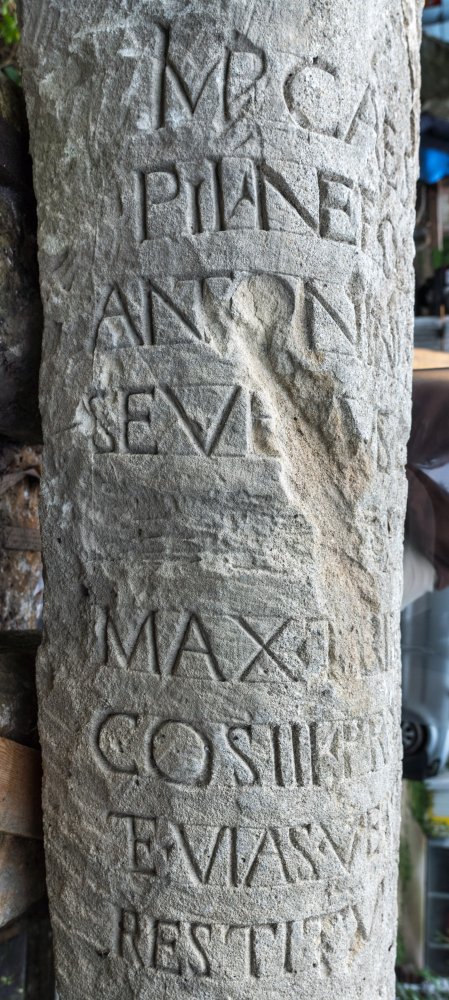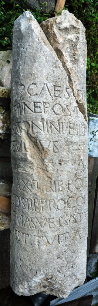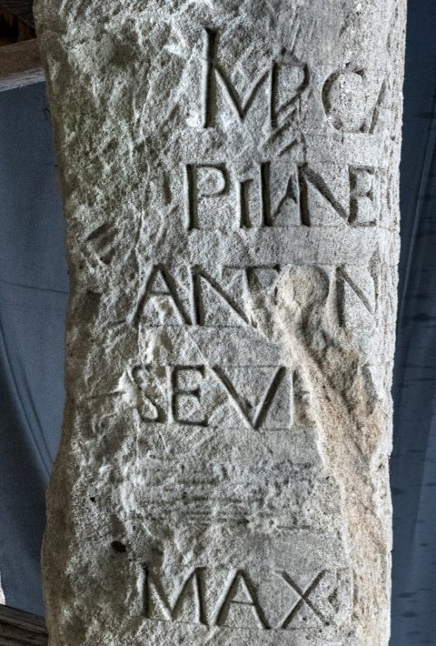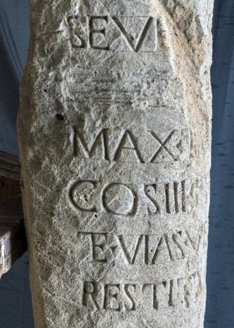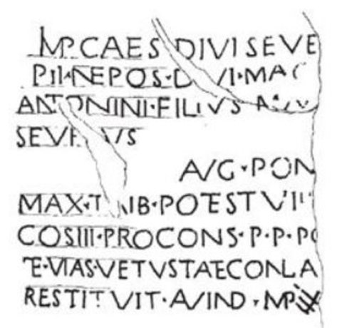 - Imp(erator) Caes(ar) divi Seve[ri] / Pii nepos d[i]vi Mag̣[ni] / Antonini filius M(arcus) Aụ[r(elius)] / Seve[r]us [[ [Alexander / pius felix]]] Aug(ustus) pon[t(ifex)] max(imus) trib(unicia) potest(ate) VIIỊ / co(n)s(ul) III procons(ul) p(ater) p(atriae) pọ[ntes] / et vias vetustate conla[psas] / restituit a Vind(obona) m(ilia) p(assuum) X̣XX[-- ?