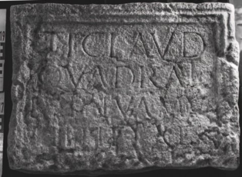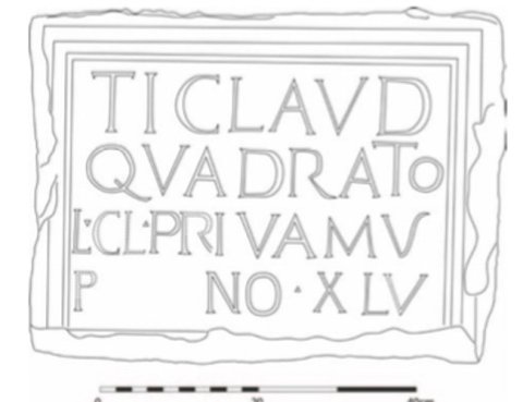 - Ti(berio) Claud(io) | Quadrato | L(ucius) [Cl(audius)] P[r]ivamus | [p(atri?) an]no(rum) XLV