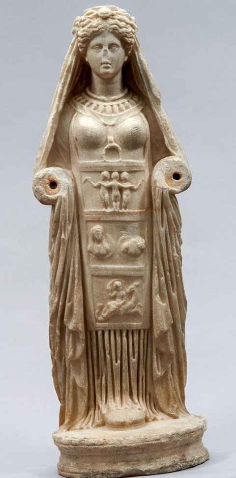 - Nachbildung des Kultbildes der Aphrodite von Aphrodisias mit Lorbeerdiadem, langem Schleier und Schurz (Ependytes) mit drei Reliefbildern (drei Grazien, Büsten von Selene und Helios, Aphrodite auf Meerwesen reitend). Halsreif mit Schlangenköpfen, Kette mit mandelförmigen Anhängern, darunter an einem Band hängende Lunula.