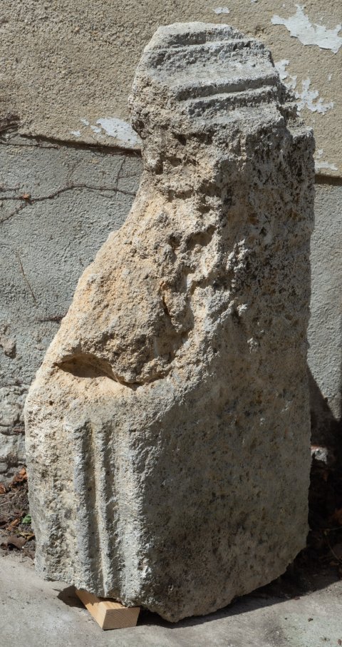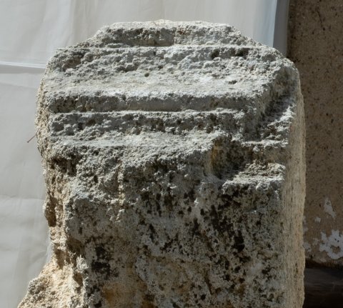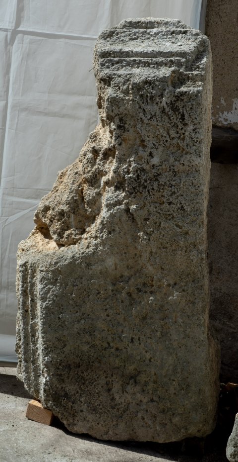 - Block mit Resten von profiliertem Rand an zwei Seiten, an der schmäleren Seite Verkröpfung des Profils. Boden- oder Zwischengesimsplatte eines Grabbaus ?