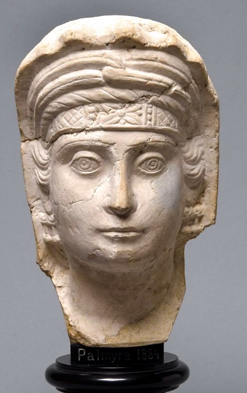 - Teil eines Hochreliefs, Porträtkopf einer Frau mit Schleier, Haube, Stirnbinde, Ohrgehängen.