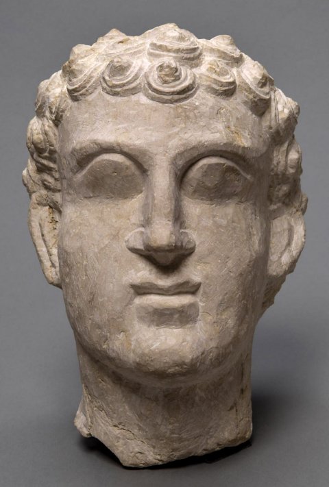 - Porträtkopf von einem Bankett-/Totenmahlrelief ? Kopf eines Jünglings mit Spirallocken über der Stirn.