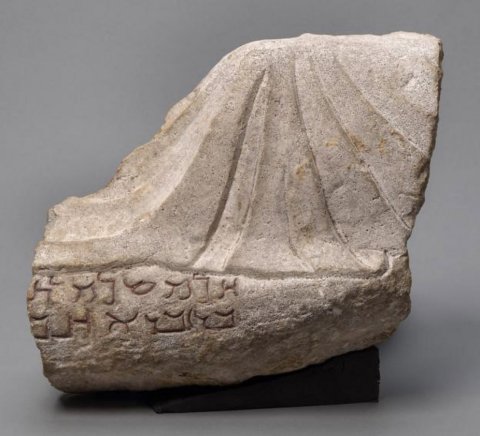 - Teil eines Bankett-/Totenmahlreliefs mit gelagertem Mann, von dem das aufgestellte linke Bein erhalten ist. Auf der Klinenmatratze Grabinschrift.