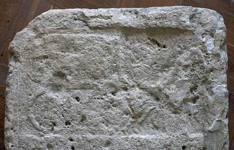 - Vorderseite einfach gerahmt, in der oberen Hälfte leicht eingetieftes Bildfeld mit Wagenszene: vierrädriger geschlossener Planwagen mit Kutscher und Zweigespann. Hinten stehende Dienerin ?
