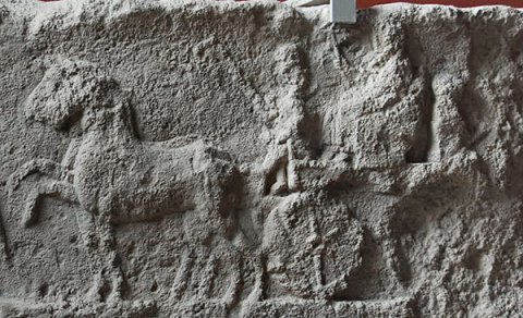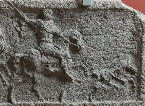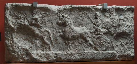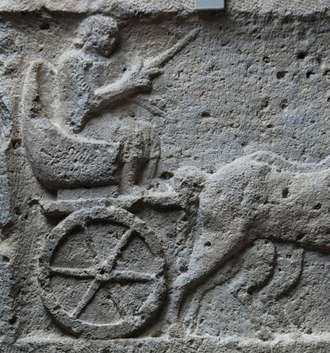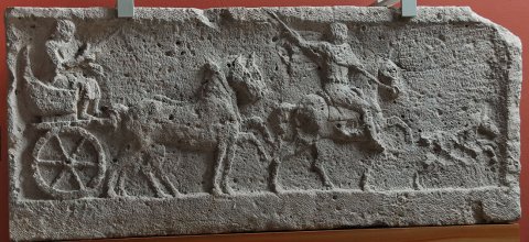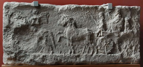 - Wagenszenen: a) vierrädriger offener Wagen mit Kutscher und Zweigespann, Frau in Lehnsessel, rückwärts Dienerin. Vor dem Wagen Reiter. b) zweirädriger Wagen mit Lehnsessel, darauf Mann, der die Zügel des Zweigespanns hält. Vor dem Wagen Reiter mit wehendem Sagum, Gürtel, erhobener Lanze, vor ihm Reh (?).