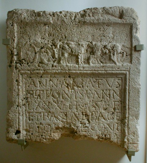 - Annamatus / Tripponis f(ilius) ann(orum) / LXXX h(ic) s(itus) e(st) / et Basiae Bage/{e}tonis f(ilia) coni/ugi [viva]e fili / [---
