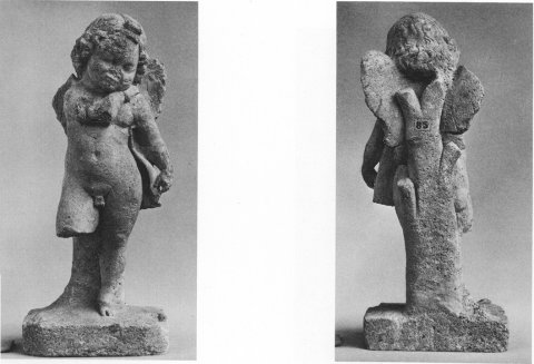 - Mythische Figur: vor einem Baumstamm stehender nackter Amor (Eros) mit Scheitelzopf, in der Linken Bogen, rechte Hand auf linker Schulter.