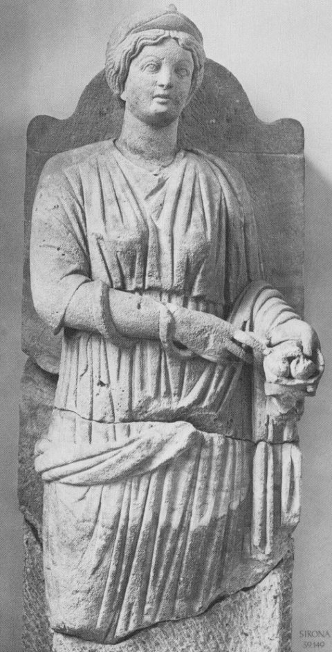- Mythische Figur: vor einer Platte mit Bogenabschluss stehende Sirona mit Diadem, Tunica und Mantel, um den rechten Unterarm windet sich eine Schlange, in Linken Gefäß mit drei Eiern. Kultbild des Tempels, zusammengehörig mit Nr. 32128.