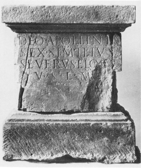 - Deo Apollini / Sex(tus) Similius / Severus ELOS / v(otum) s(olvit) l(ibens) m(erito)