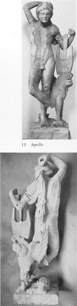 - Teile der Plinthe, rechter Fuß, T, der linken Hand des Apollo, Hinterteil und Schnabel des Greifen fehlen, linkes Bein des Apollo u. Vorderbeine des Greifen tlw. ergänzt. Körpervorderseite des Apollo flächig abgeschlagen.