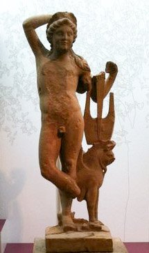- Mythische Figur: mit gekreuzten Beinen stehender nackter Apollo, der einen Mantel hinter seinem Rücken hält. Neben dem linken Bein stehender Greif, auf dessen Kopf die Kithara aufliegt, die Apollo mit der Linken hält.