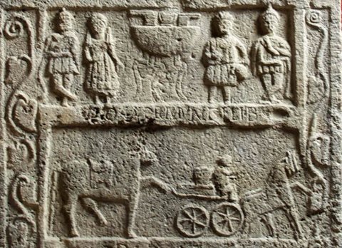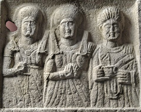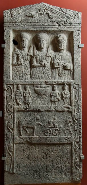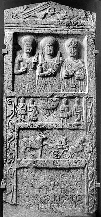 - Formel "Dis Manibus", einheim. Name und Frauentracht, bärtiger Mann, Stil des Reliefs