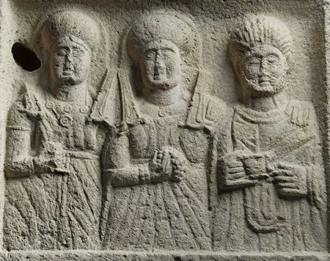 Im Hauptbild Familie: in Rechtecknische Halbfiguren von drei Personen. Links einheimische Frau: Haube, Schleier, Fibeln, Brustschmuck mit drei Scheiben, Armbänder, Gürtel, in der Rechten Apfel. In der Mitte einheimische Frau: Haube, Schleier, Fibeln, Brosche, Armbänder, Gürtel, in der Rechten Weintraube. Rechts Mann: bärtig, gesträhntes Haar, Sagum, Scheibenfibel, in der Rechten zweihenkeliger Becher.