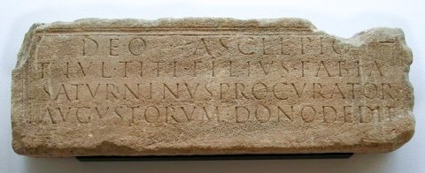 - Deo Asclepio / T(itus) Iul(ius) Titi filius Fabia / Saturninus procurator / Augustorum dono dedit