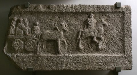 - Wagenszene: vierrädriger offener Wagen mit Kutscher und Zweigespann. Zwei verschleierte Frauen auf Lehnsessel, dahinter stehende Dienerin. Vor dem Wagen Reiter im Mantel.