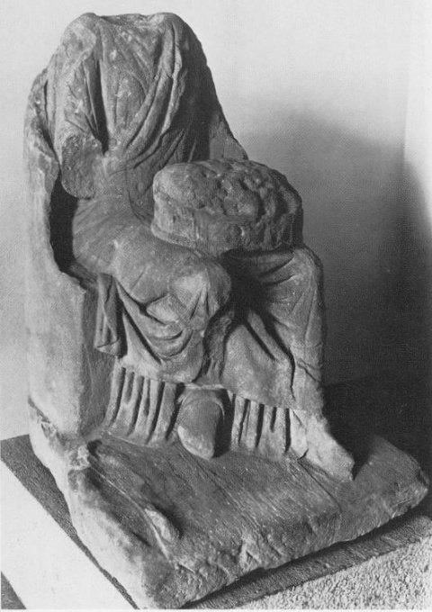 - Mythische Figur: auf Lehnsessel sitzende Göttin in Tunica, Mantel und Schuhen, auf den Knien Korb mit Früchten, neben dem rechten Fuß Rest der Vorderläufe eines liegenden Tieres (Hund ?).