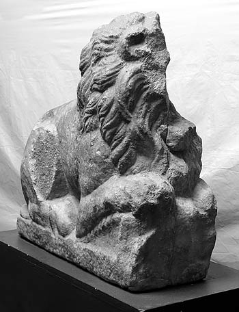 - Auf flacher Basisleiste liegender Löwe mit Tierkopf in den Pranken.