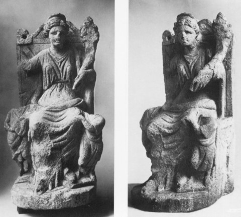 - Mythische Figur: auf Thron mit verzierter Rückenlehne (Giebel mit Akroteren) sitzende Göttin mit Diadem, in Chiton und Mantel, im linken Arm Füllhorn. Zu beiden Seiten der Beine je eine kleinere männliche Figur, die linke in Toga, die rechte in Tunica und Mantel (Adoranten ?).
