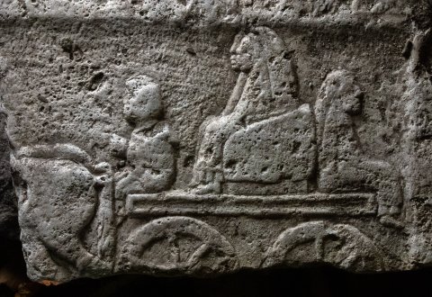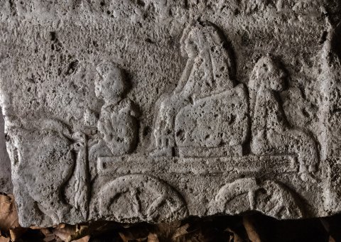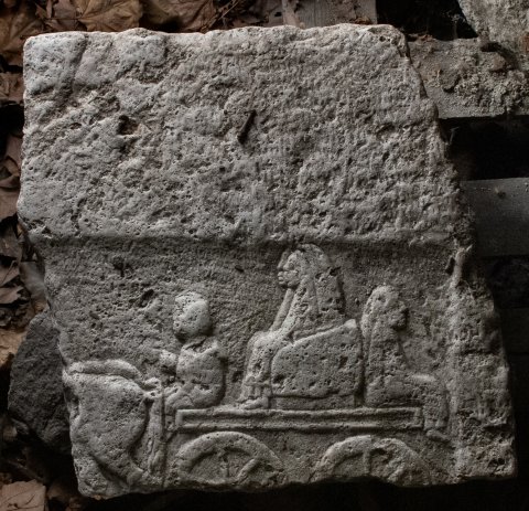 - Wagenszene: in flach eingetieftem Rechteckfeld nach links fahrender vierrädriger offener Wagen mit Zweigespann, Kutscher, Ehepaar auf Lehnsessel, rückwärts Dienerin.