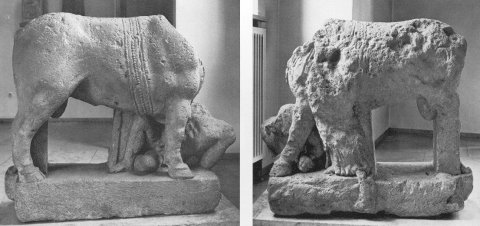 - Mythische Figur : Stiergott (dreihörniger Stier ?) mit perlenverzierter Binde um den Leib. An seiner linken Seite gehende Frau in langem Gewand, unter seinen Vorderbeinen kauernde nackte männliche Figur mit gefesselten Armen. Auf der Vorder- und linken Langseite der Plnthe je ein Fisch. Stützen zwischen Hinter- und Vorderbeinen.