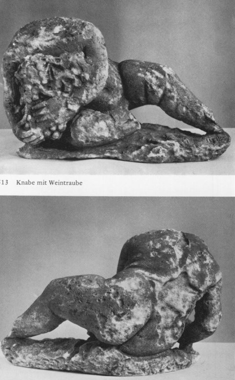 - Auf flacher Plinthe gelagerter kindlicher nackter Knabe, der mit beiden Händen eine Weintraube vor der Brust hält.