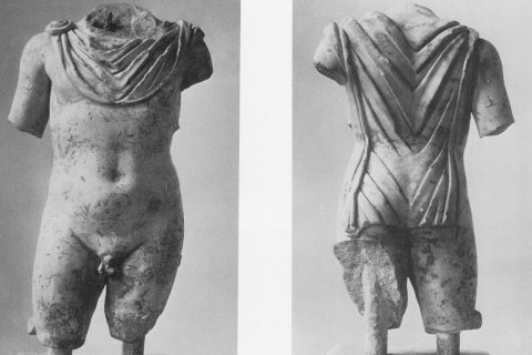 - stehender nackter Knabe, Mantel mit Scheibenfibel über Schultern und Rücken, nach Reliefspuren auf der Brust hielt er einen Vogel mit der linken Hand