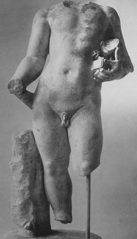 - Stehender nackter Knabe, auf der linken Hand Kästchen mit leicht geöffnetem Deckel, auf dem ein Vogel sitzt. Neben dem rechten Bein Stütze.